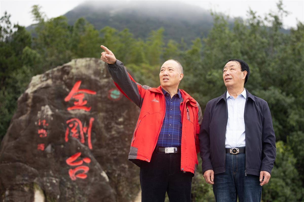 2025年10月17日,金刚台下,张敏的孙子曾祥有(右)、曾祥海远眺她曾经战斗生活过的大别山深处。湖北日报全媒记者何宇欣 摄