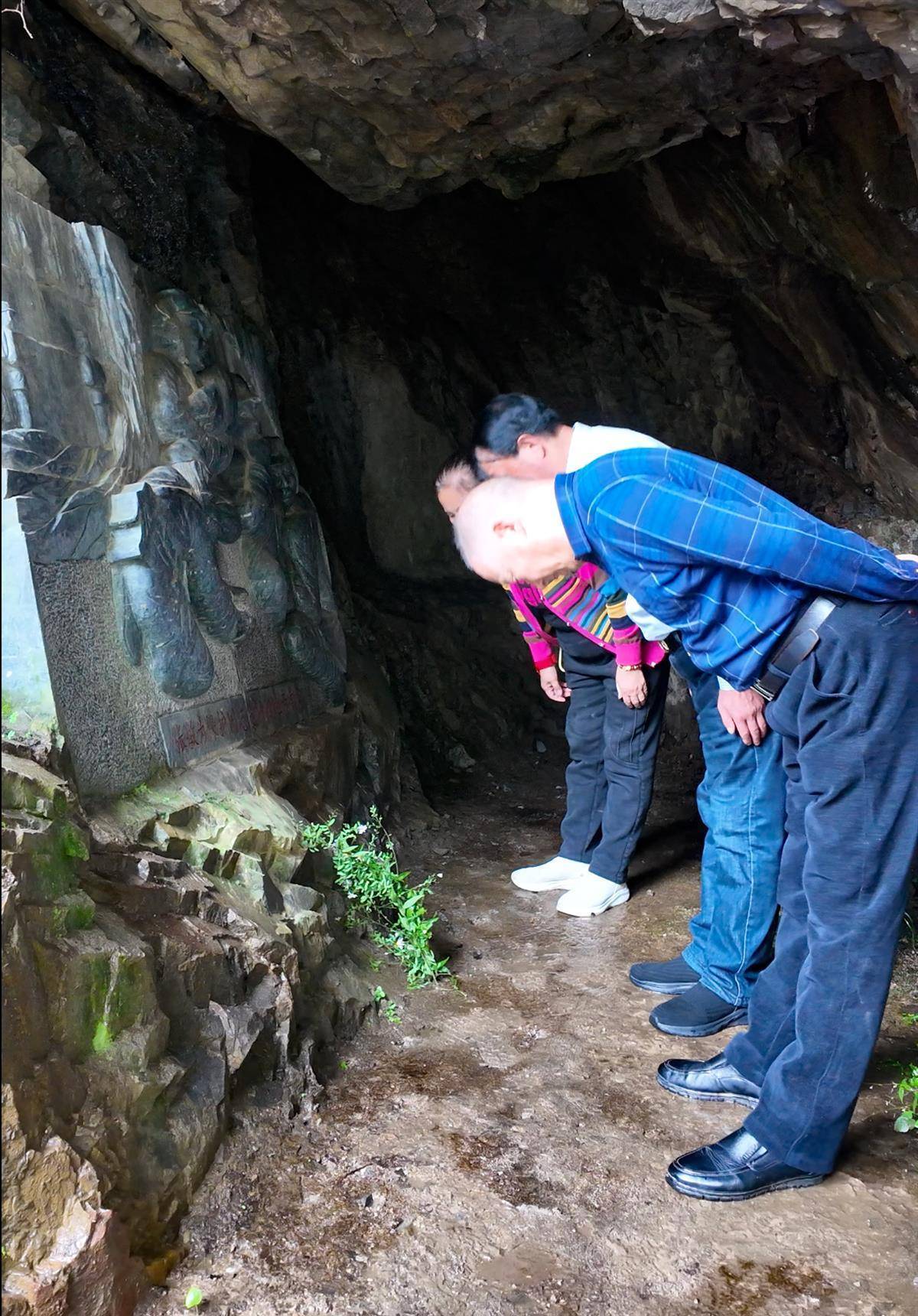 2025年10月17日,在金刚台张敏曾经战斗生活过的红军洞内,张敏后人向她的壁画鞠躬致敬。湖北日报全媒记者何宇欣 摄