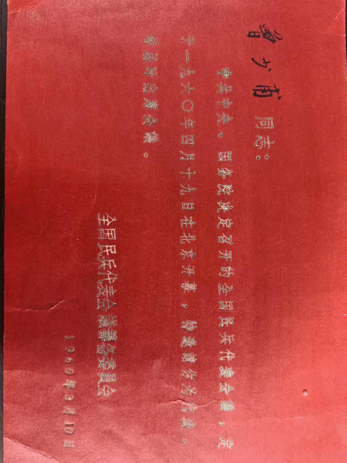 曾少甫出席全国民兵代表大会的邀请函。湖北日报全媒记者柯利华 摄